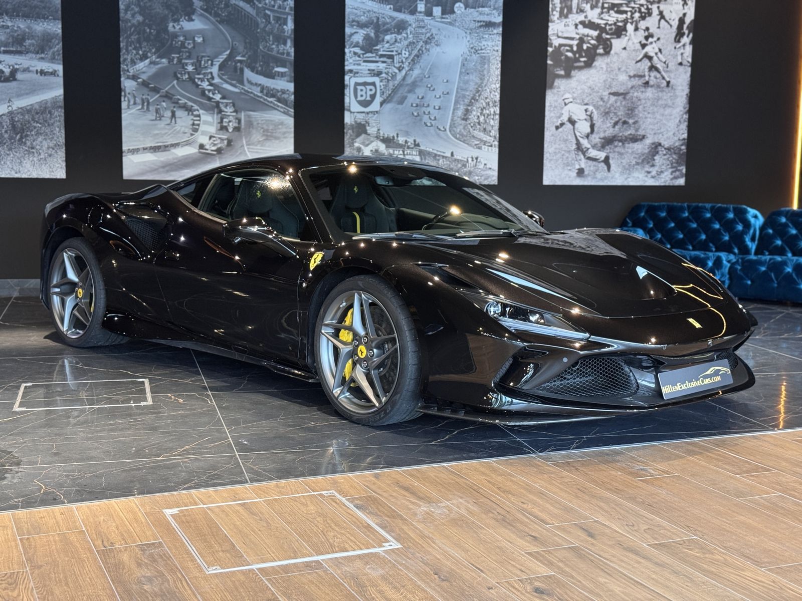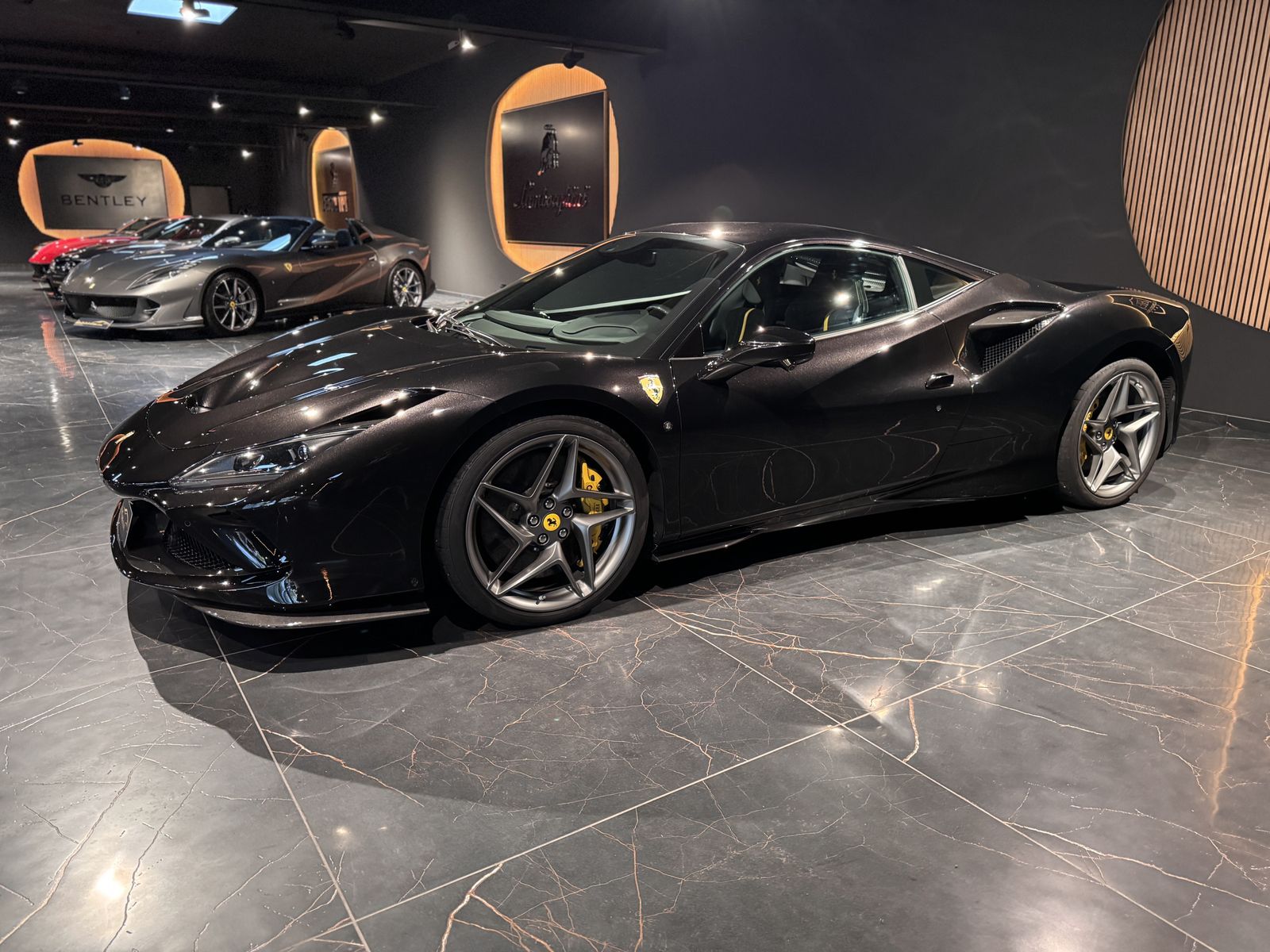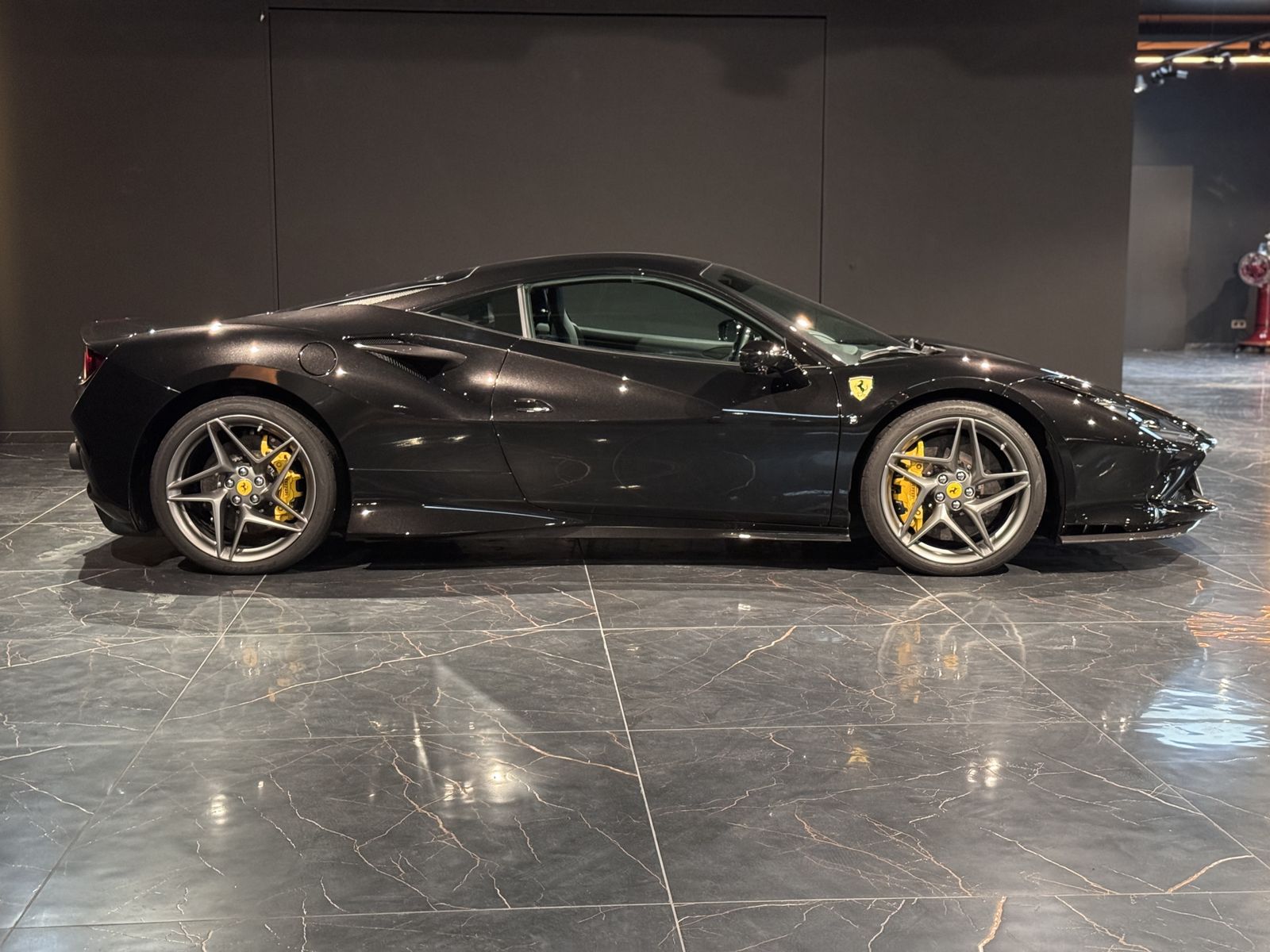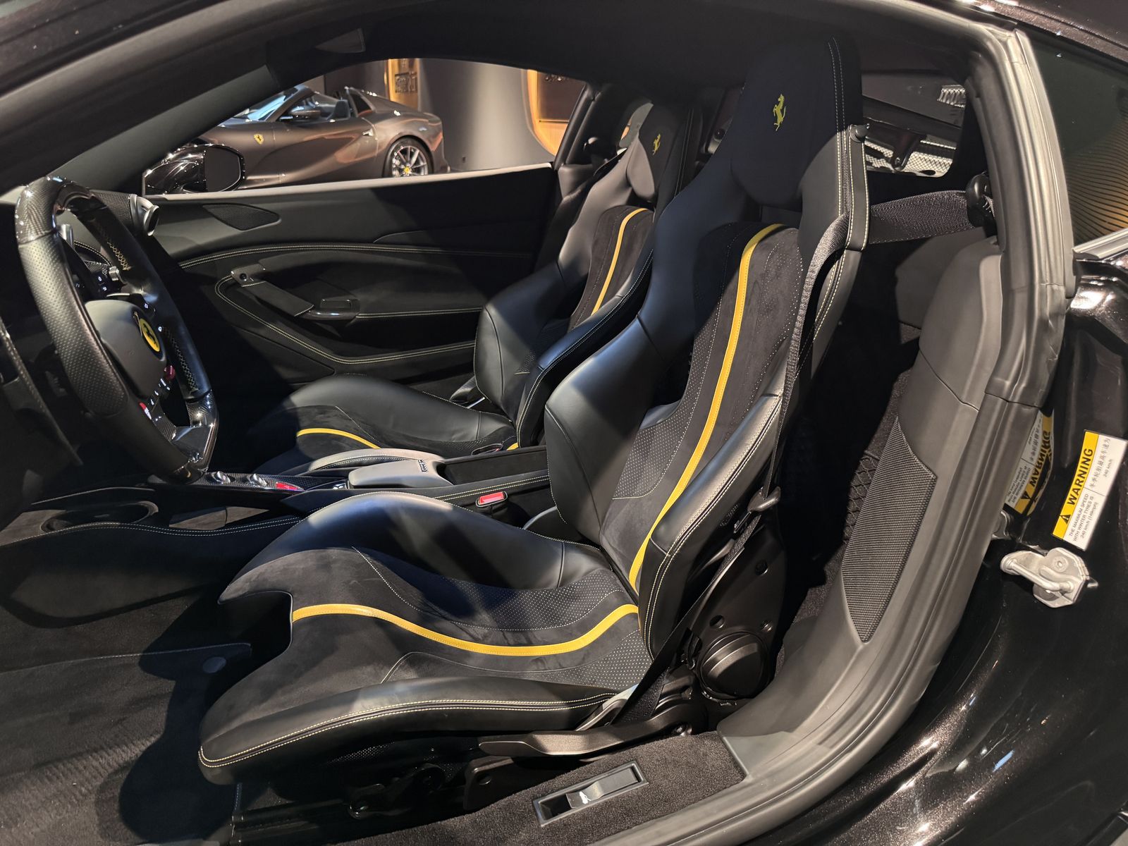 schöner Ferrari F8 in schwarz mit schwarzem Interieur und gelben Stitching.