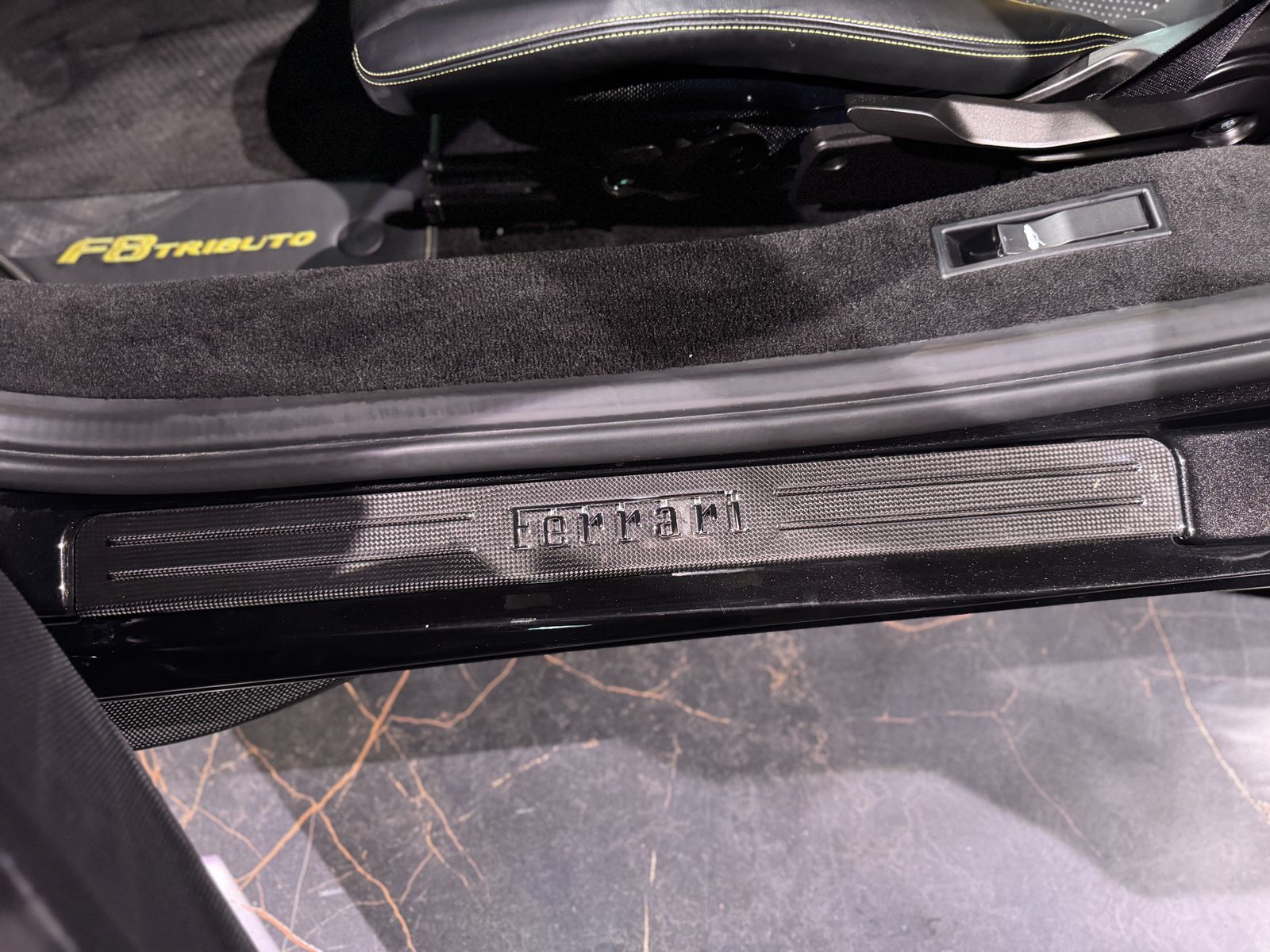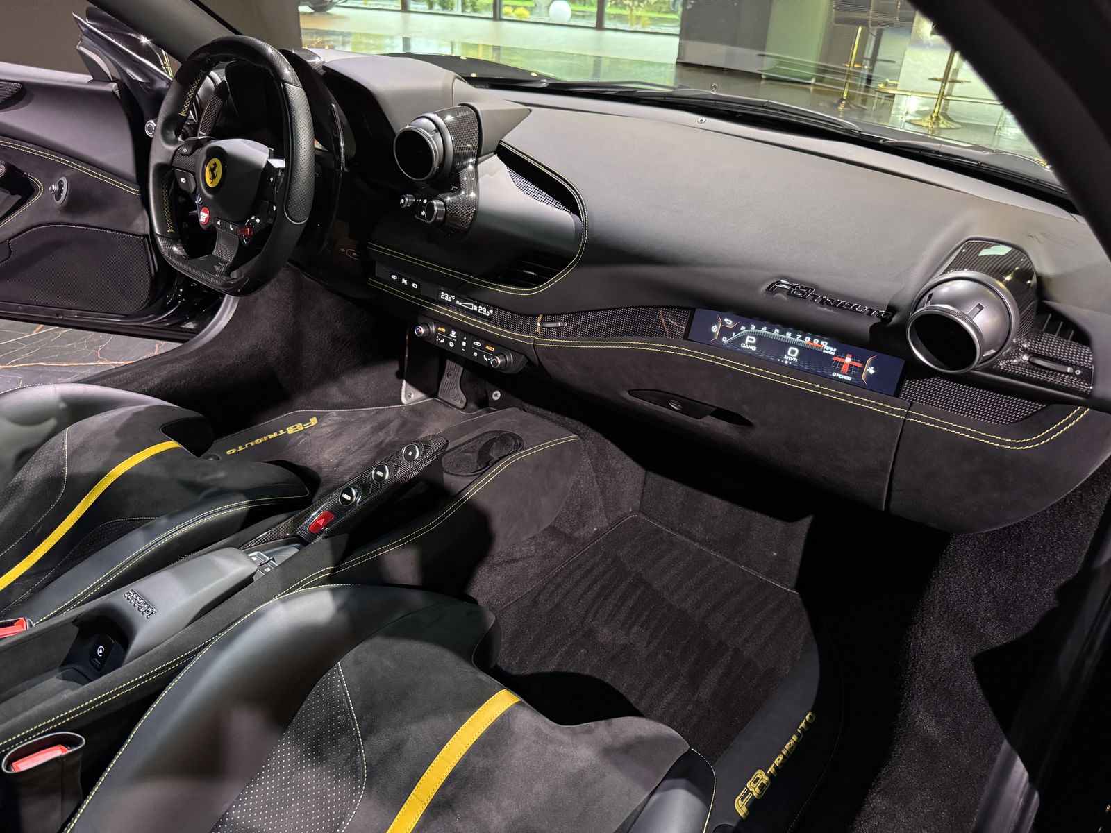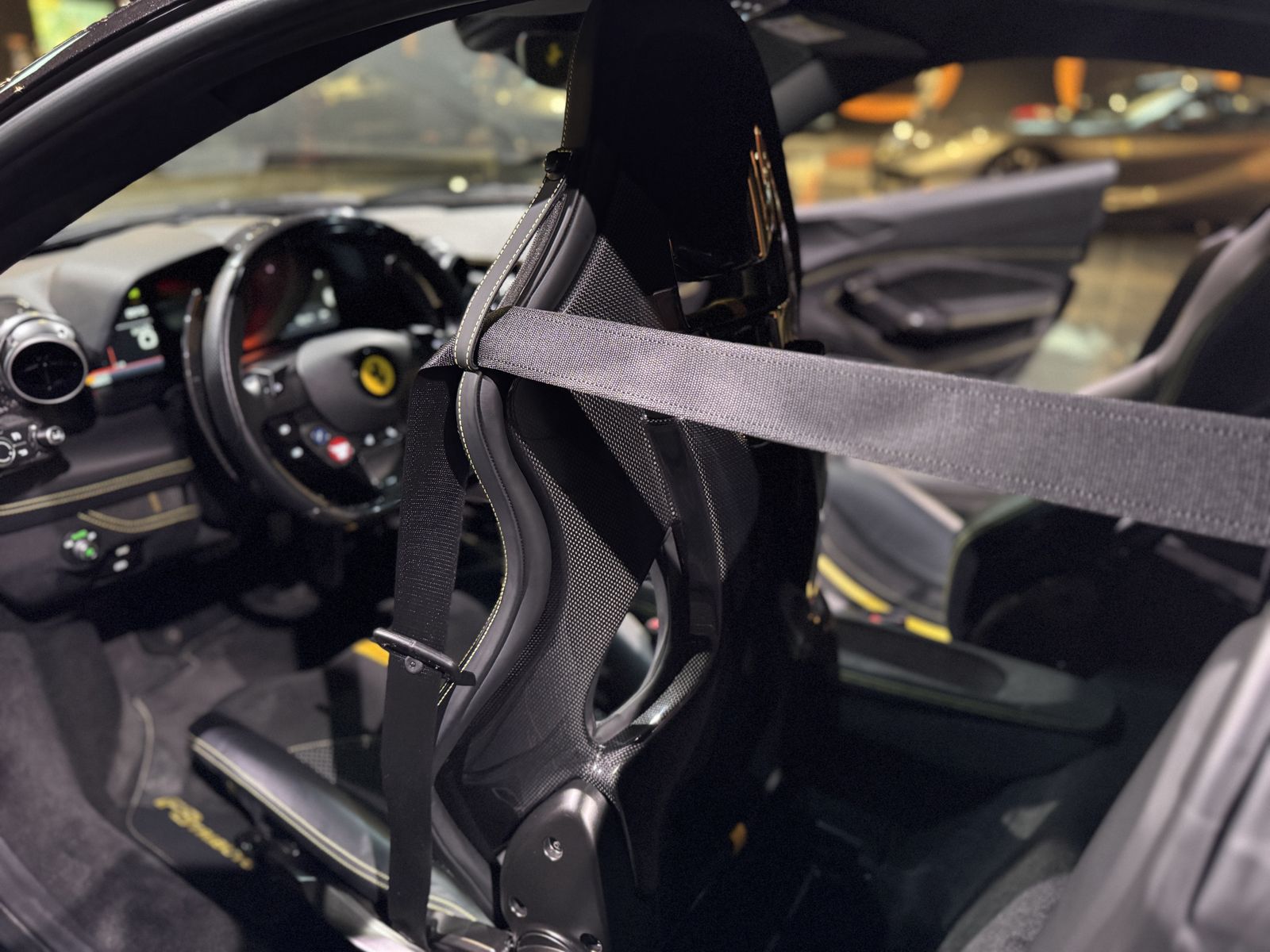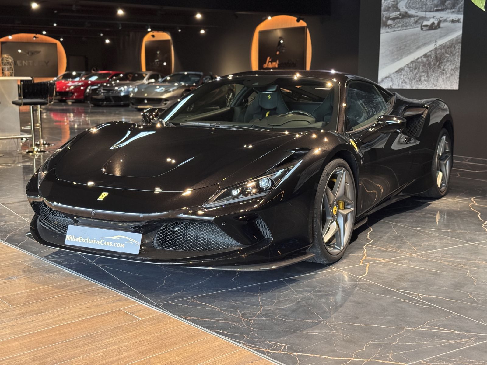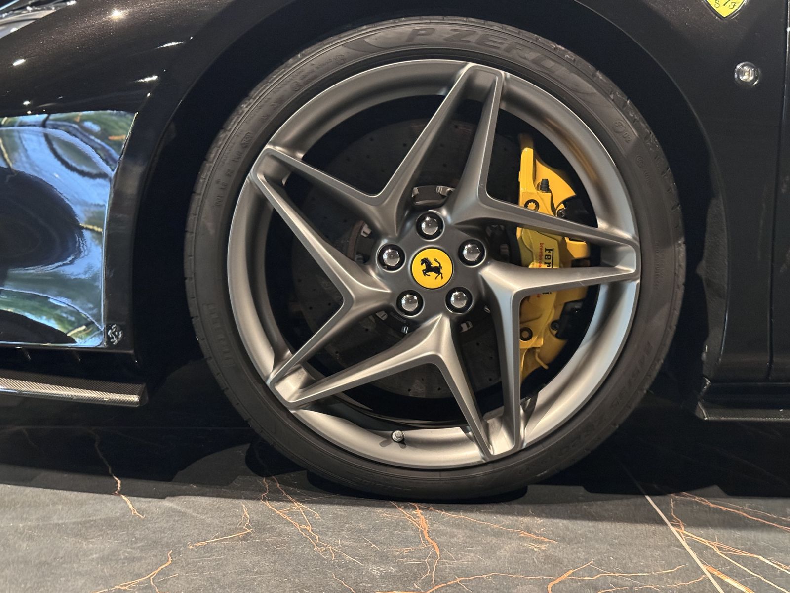 schöner Ferrari F8 in schwarz mit schwarzem Interieur und gelben Stitching.