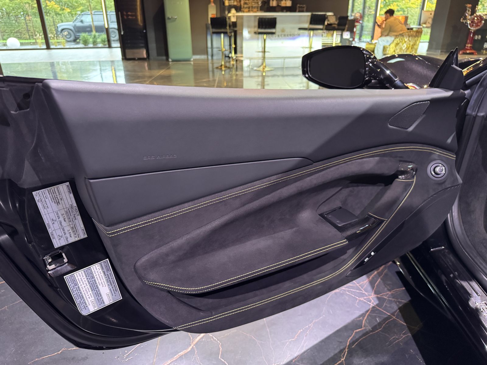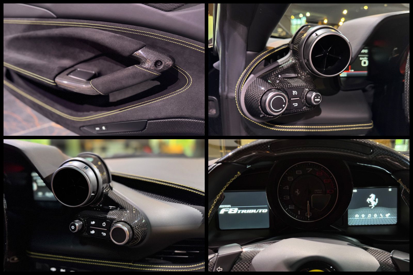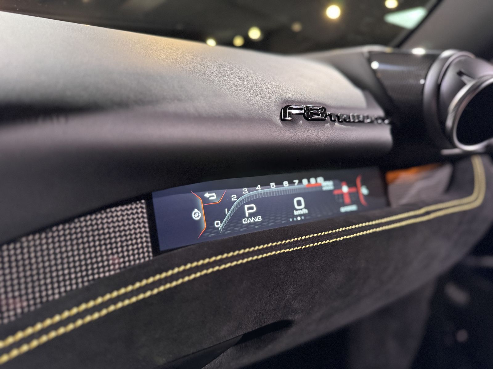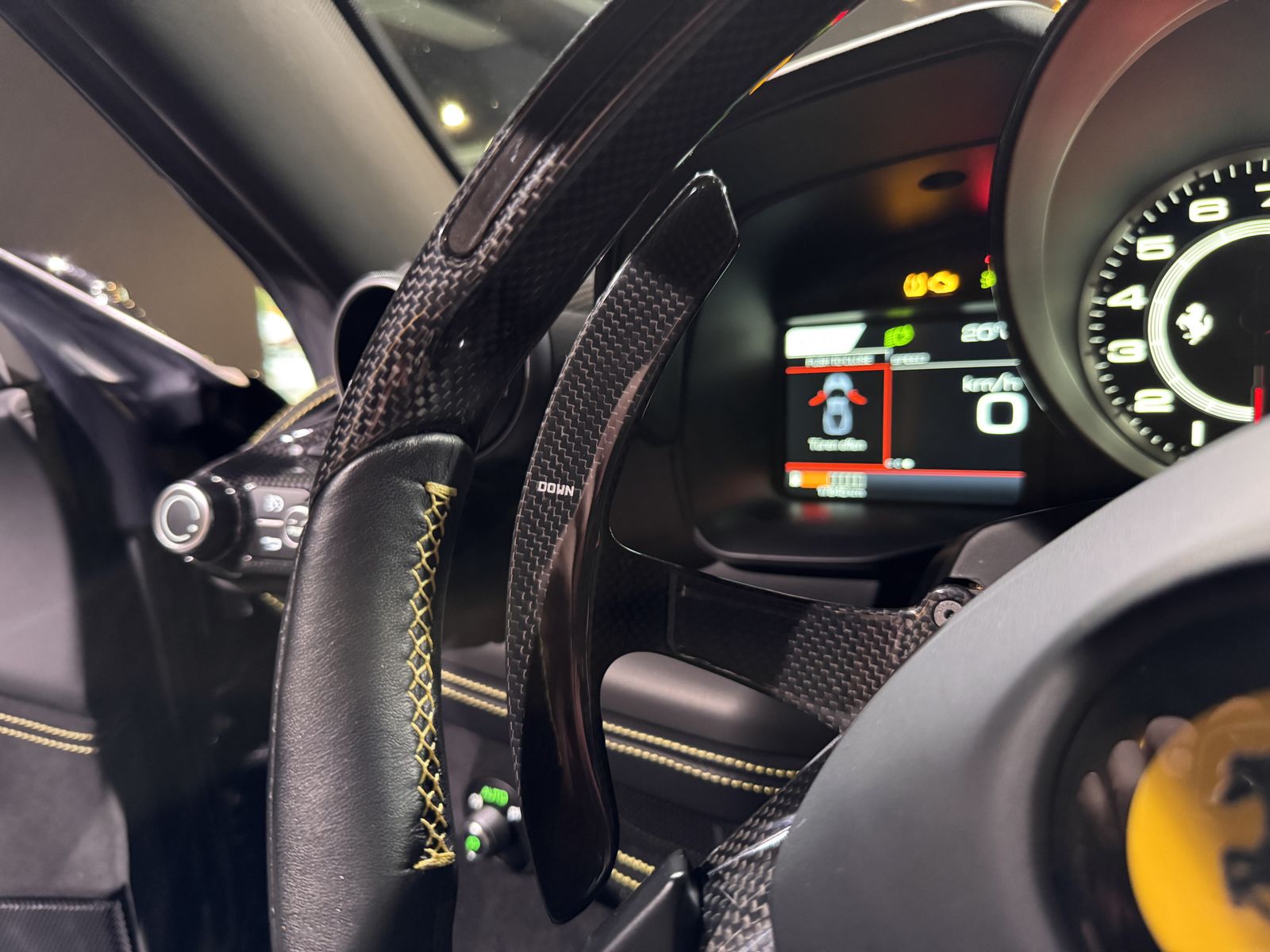 schöner Ferrari F8 in schwarz mit schwarzem Interieur und gelben Stitching.